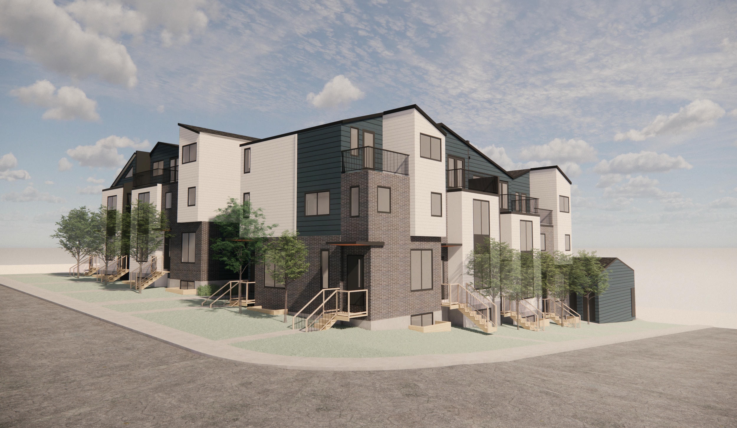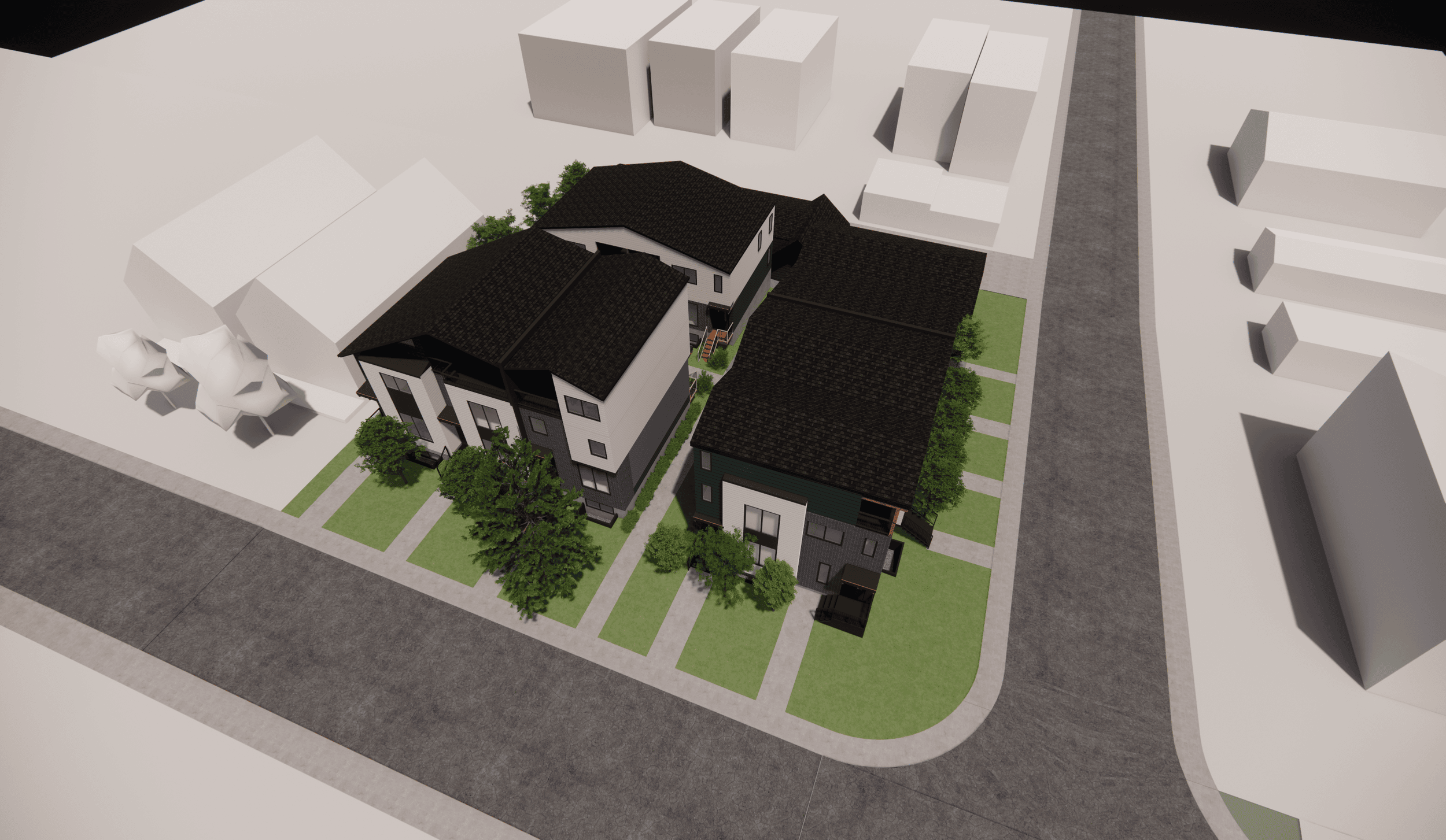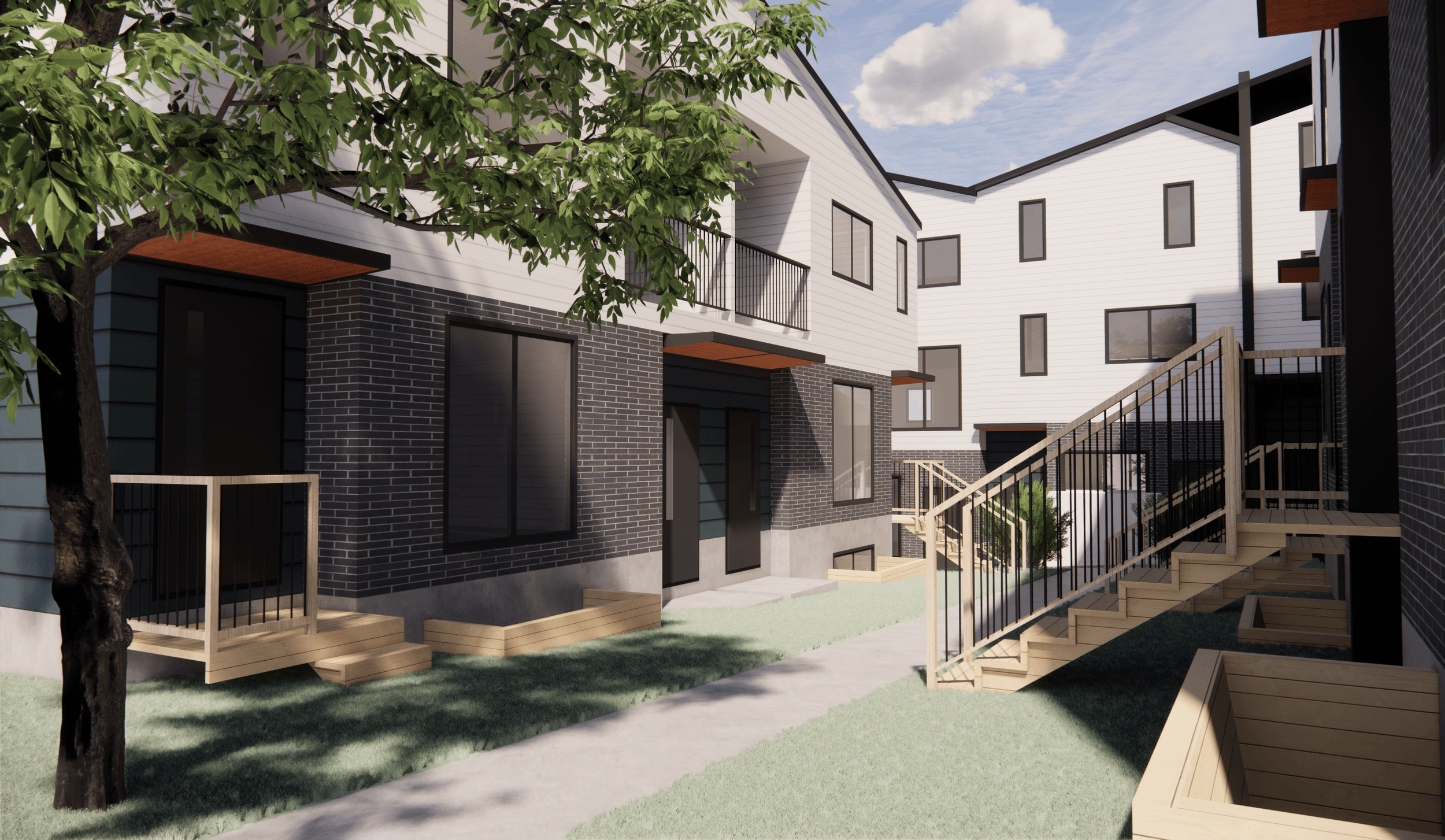 2004 South Calgary 9+9 is a 9 unit and 9 suite development, arranged in a three-building configuration, which forms around a shared courtyard amenity. The innovative design addresses the challenging slope of the site by staggering the unit entrances, creating a roofline reminiscent of Alberta’s Mountain ranges. The courtyard configuration allows for maximized density while optimizing the number of units that face the street. Suites all have individual entrances off the courtyard space, independent from the upper unit entrances.