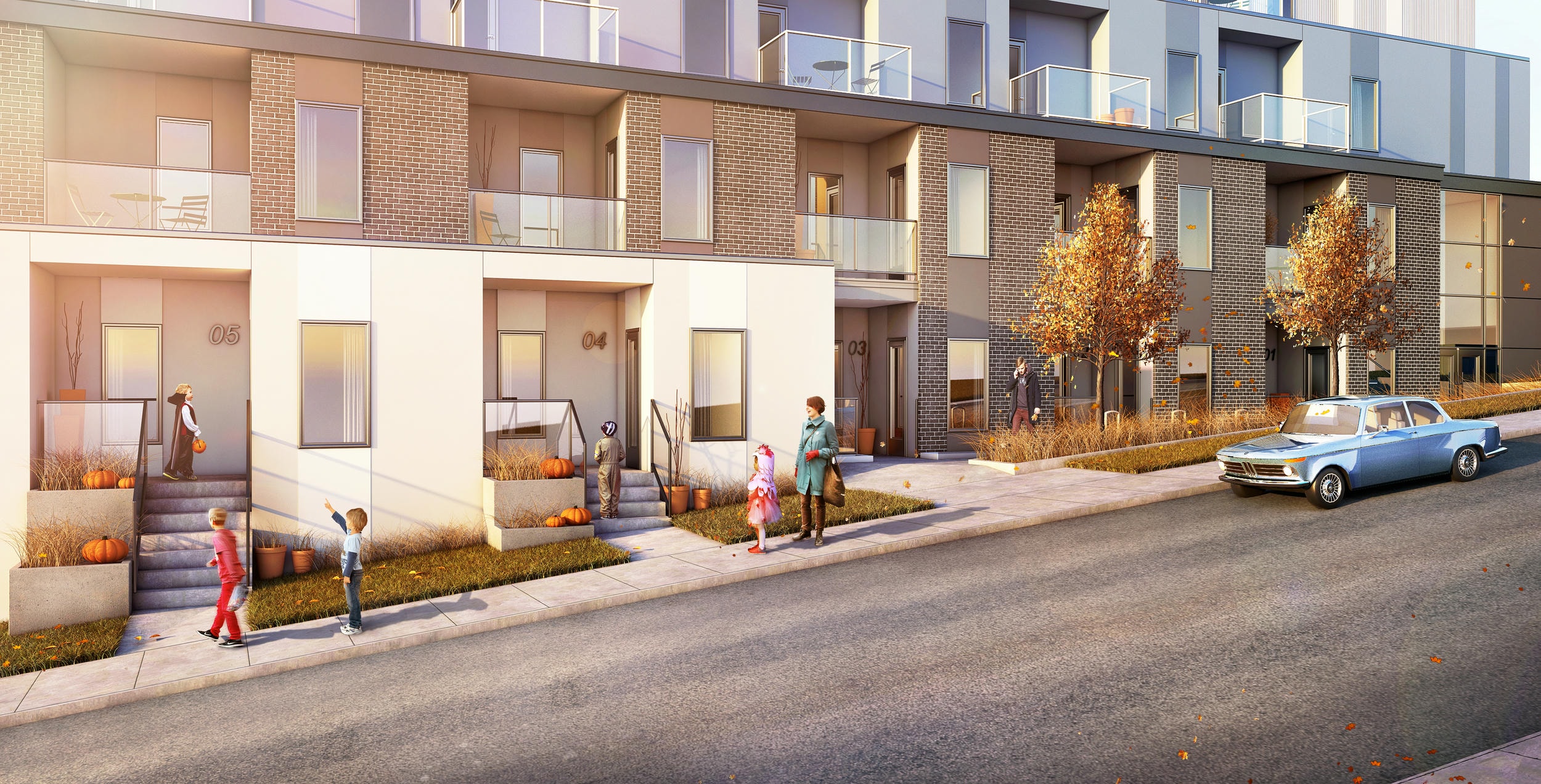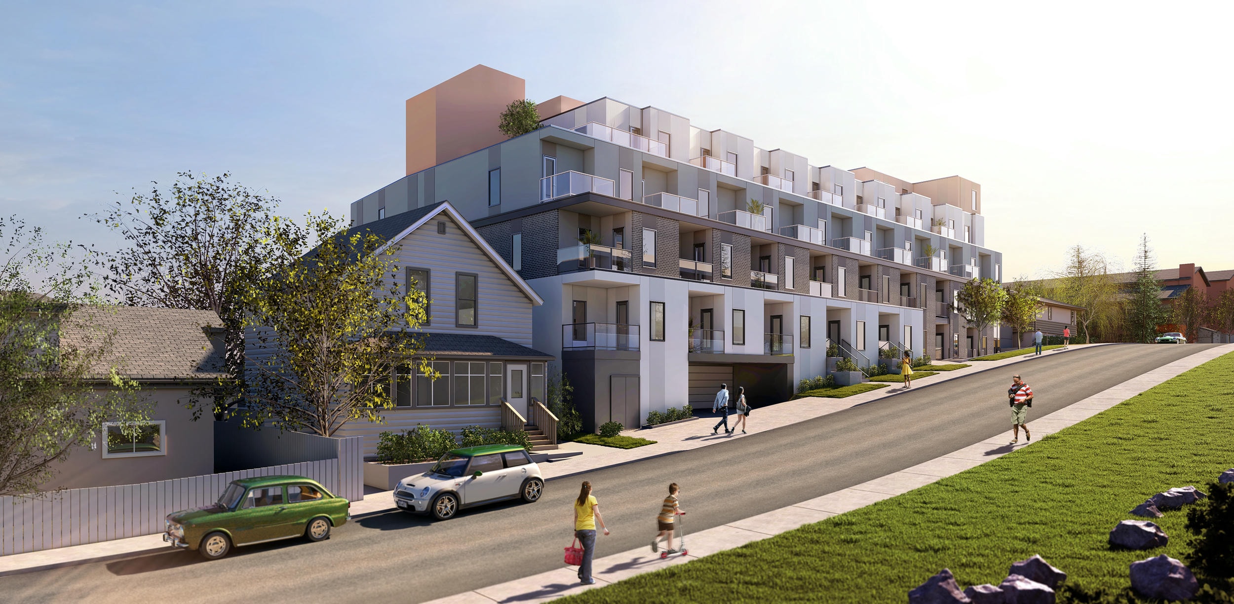 In addition to the stepback, material transitions across the facade are designed to consider transition with its neighbors to create a scale appropriate addition to its context.