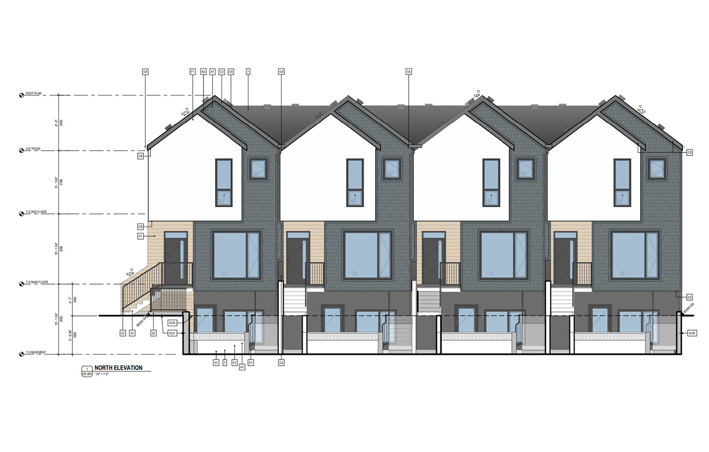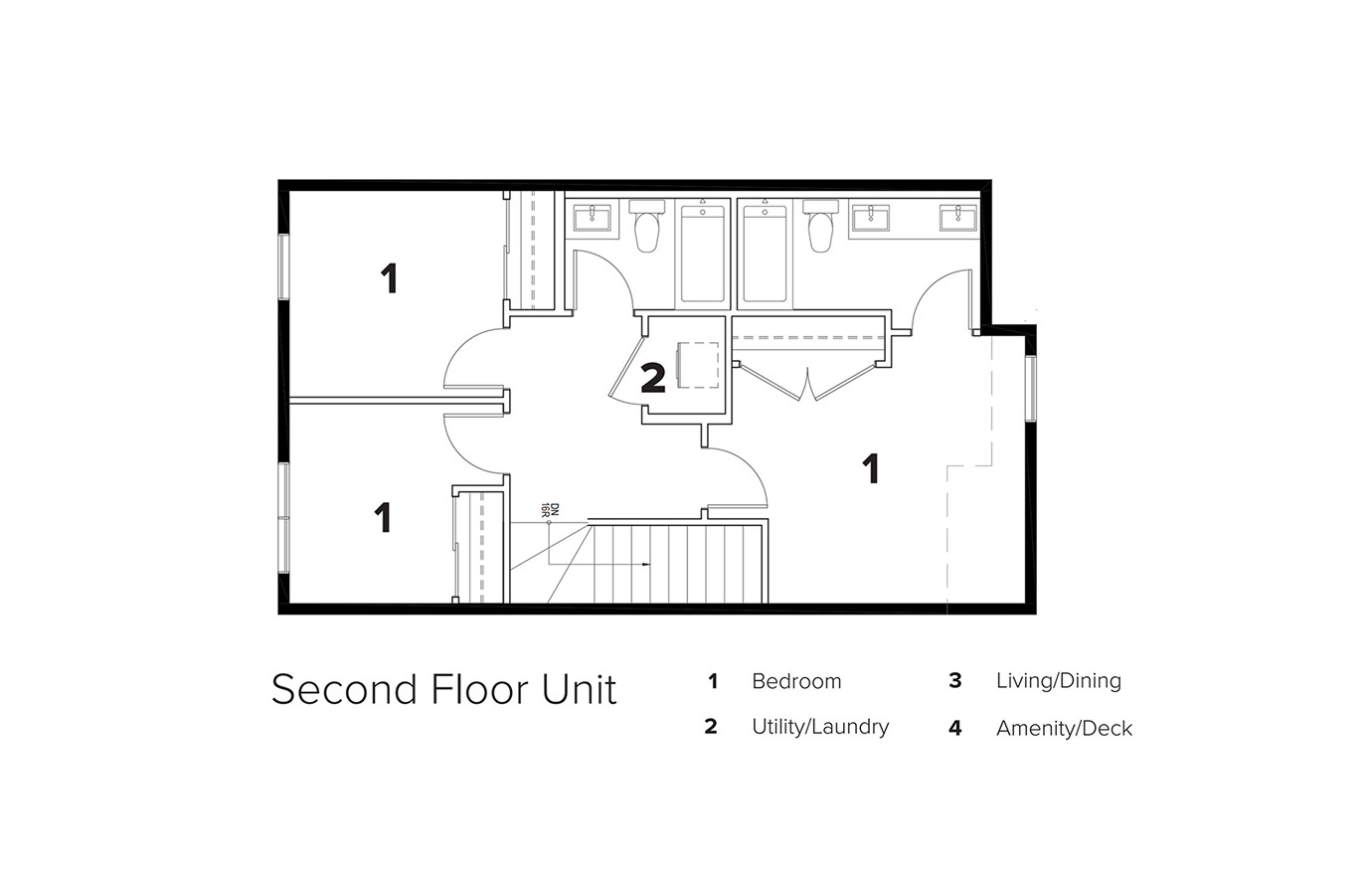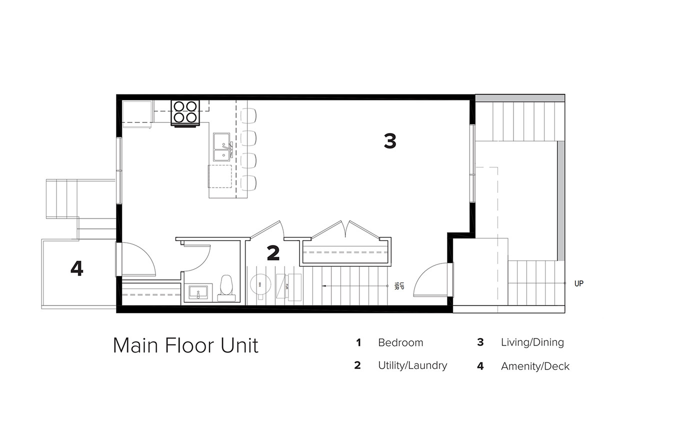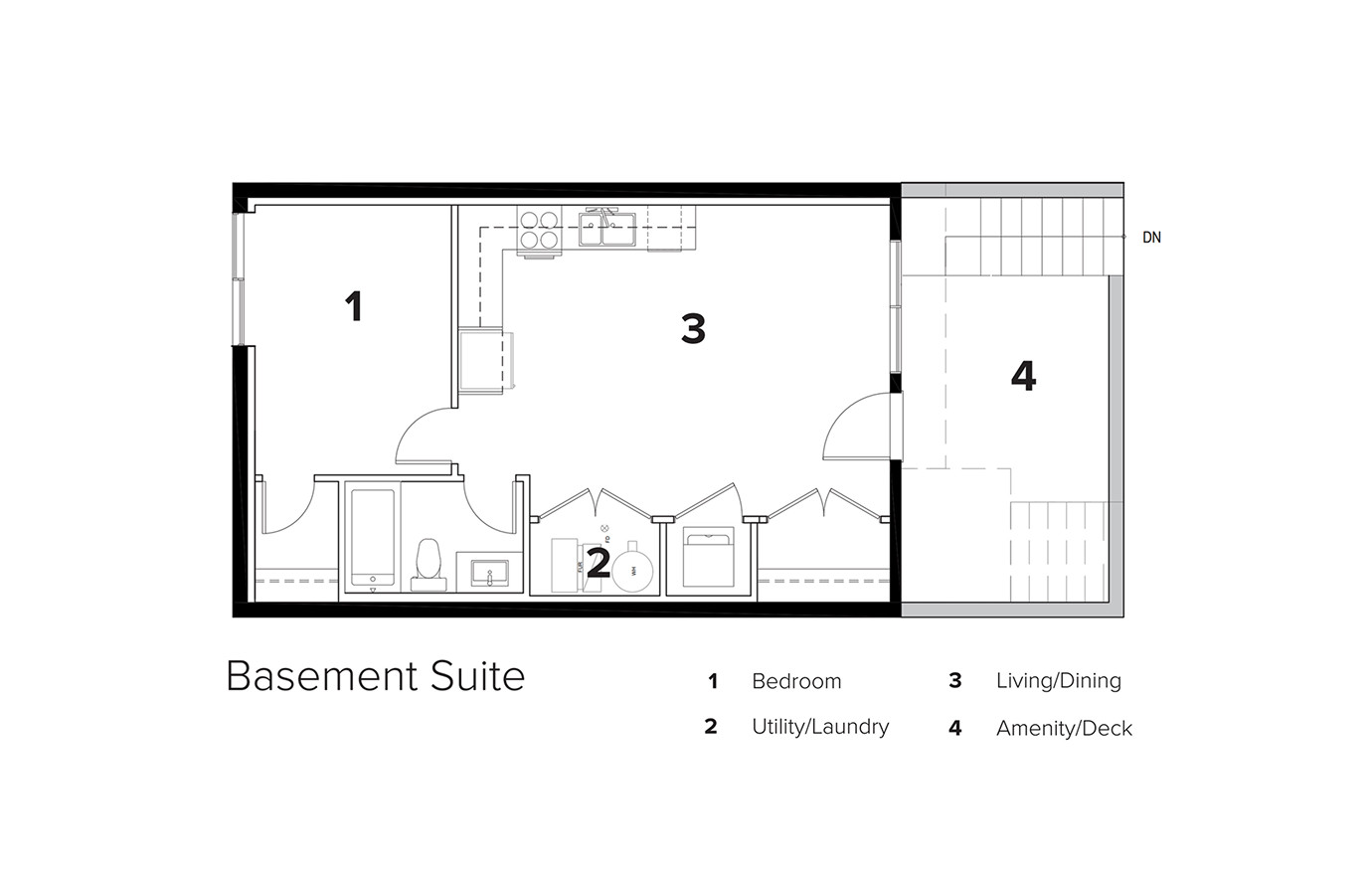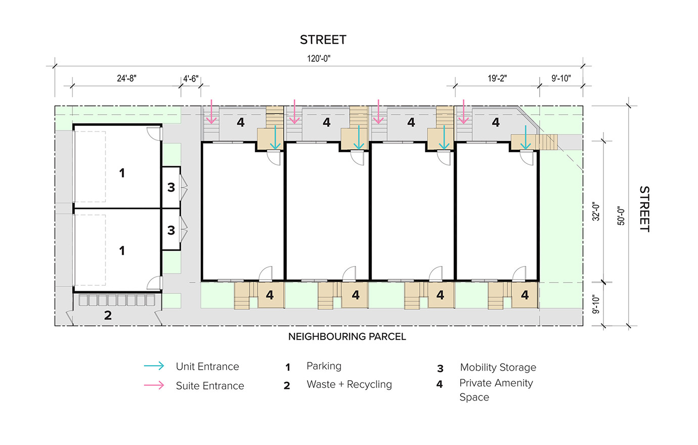 The FAAS 4+4 corner lot townhouse, Arbor, is designed with a raised basement to enhance livability while maintaining a modest two-storey profile suited for Calgary’s corner lots. The raised basement allows for increased light into the suites, and the entrances into these areas also serve as amenity space to be used by the residents of these suites. Under-stair storage compliments this amenity space with further functionality.