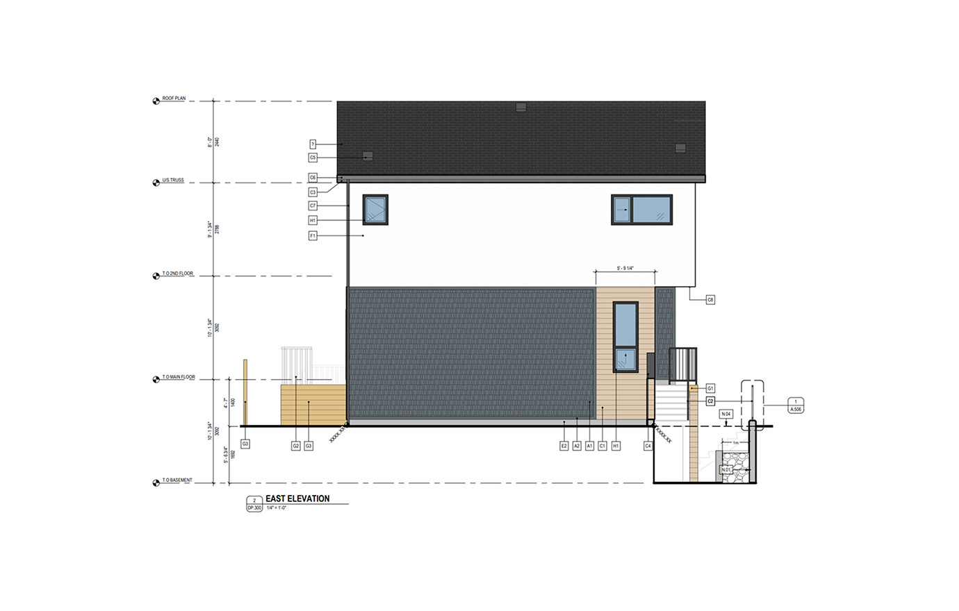 The building’s massing takes inspiration from traditional house forms, with peaks within peaks, allowing it to blend seamlessly into surrounding neighborhoods. The massing is designed with distinct architectural elements, such as mutiple eave lines, railings that function as permeable and solid, and a massing that was focused on creating a relationship with the neighbourhood. As with all Infill Fastrack designs from FAAS, durable materials such as cement board, metal siding, and stucco define the exterior.