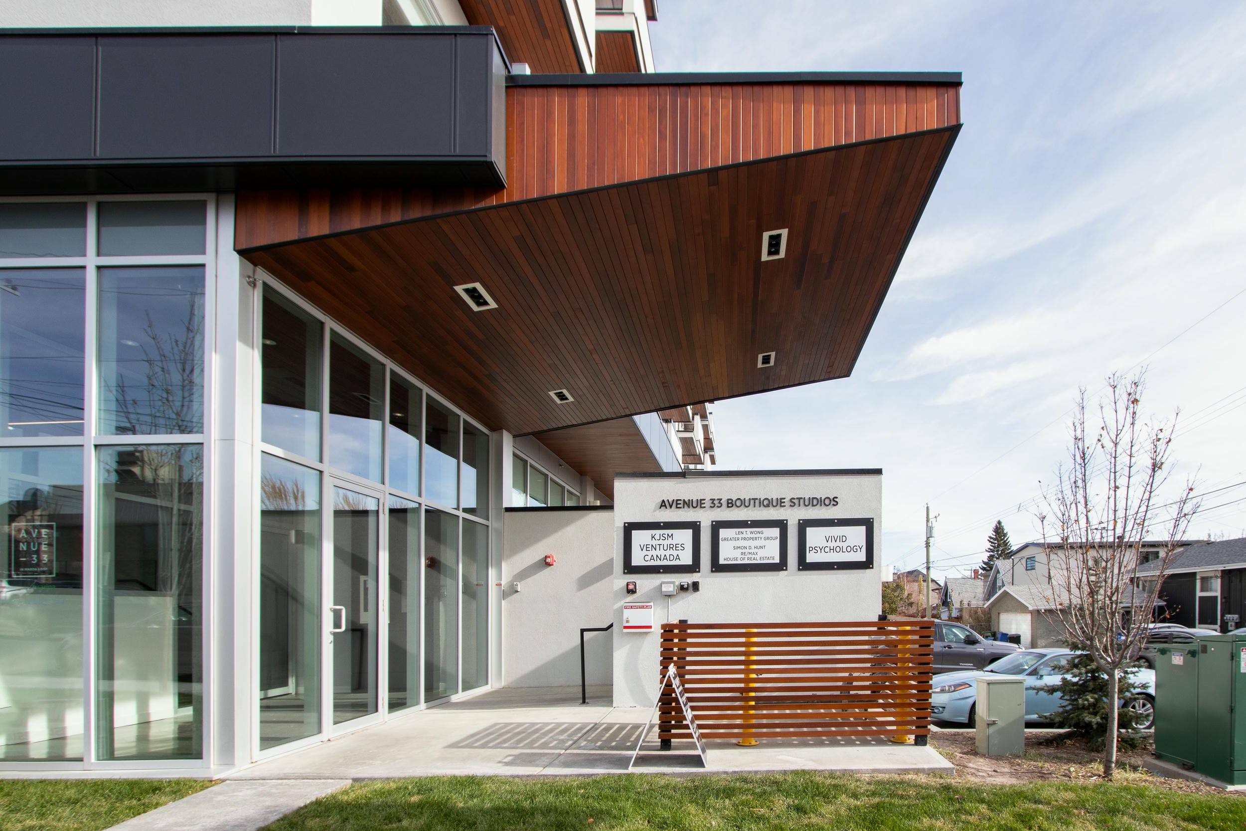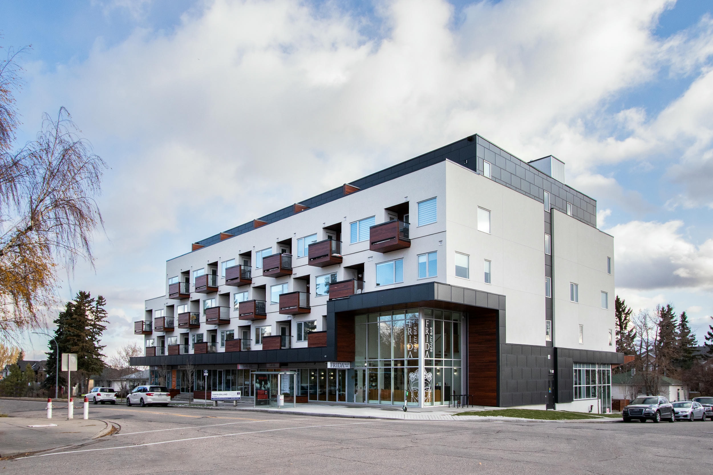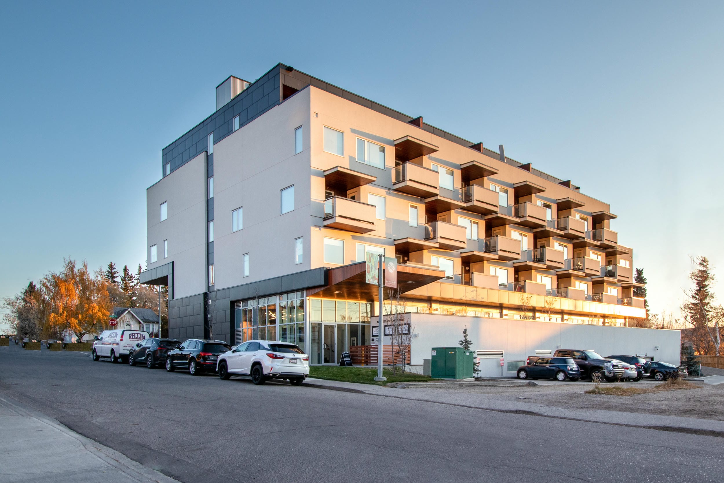 The project entails 42 condominium units above 300 sqm of commercial area. Located in the community of Marda Loop, this site is located on a busy pedestrian corridor facing commercial activity on the north and residential conditions on the south. The façade responds to the dual conditions through materiality, massing, and unit exposure. The units to the north are programmed with urban-type lofts facing the city, while the south has residential condominium-type floor plans.