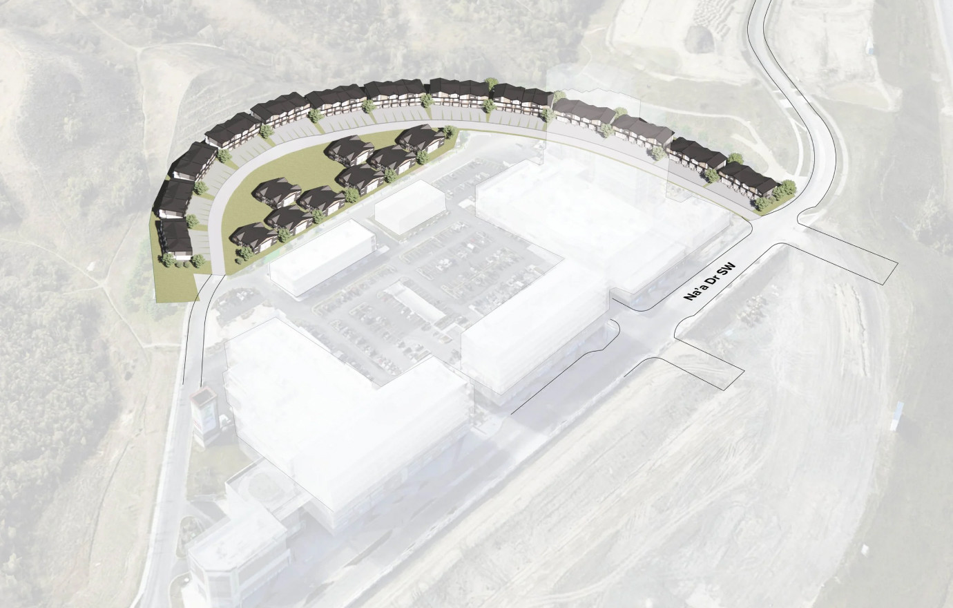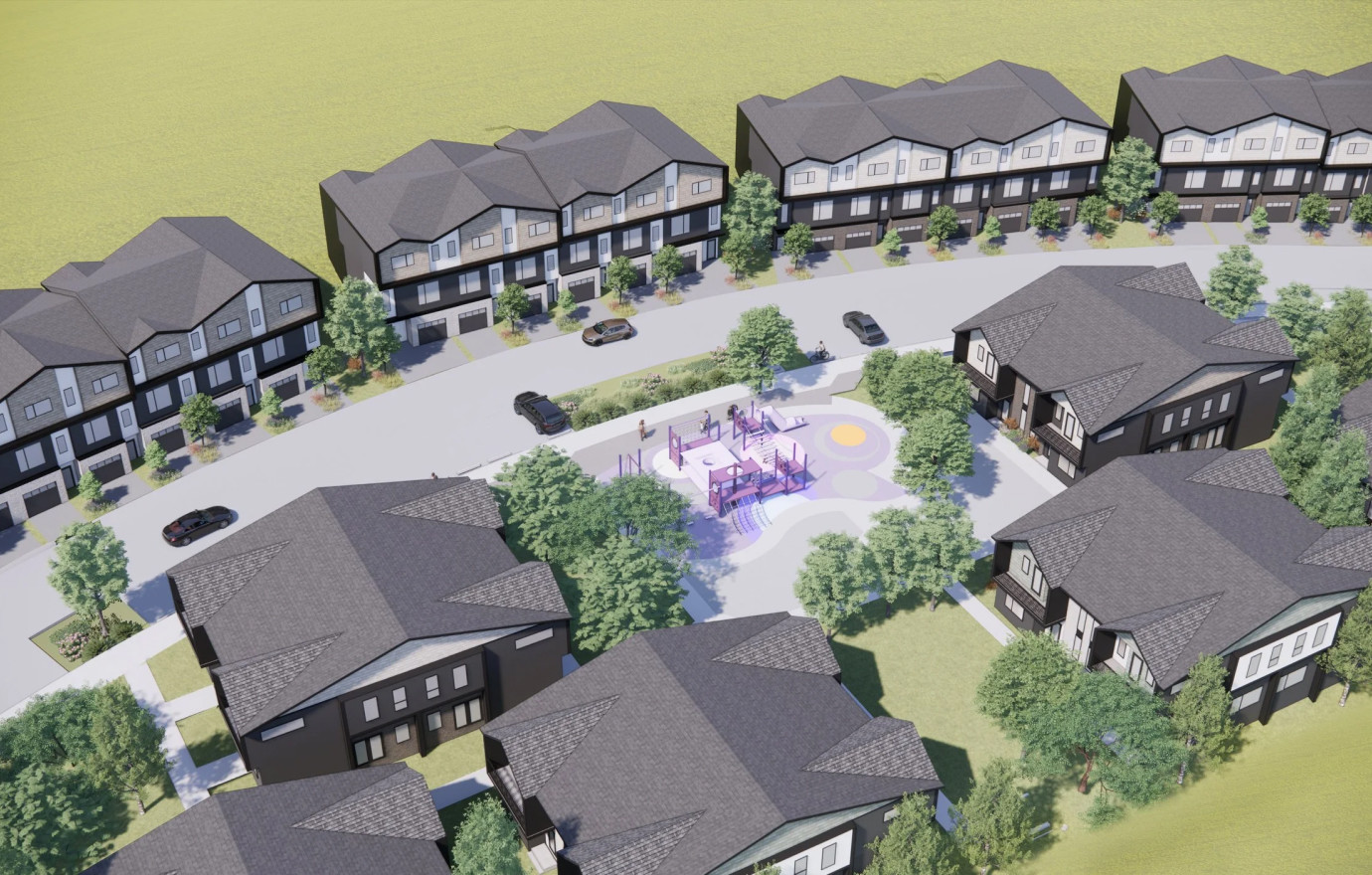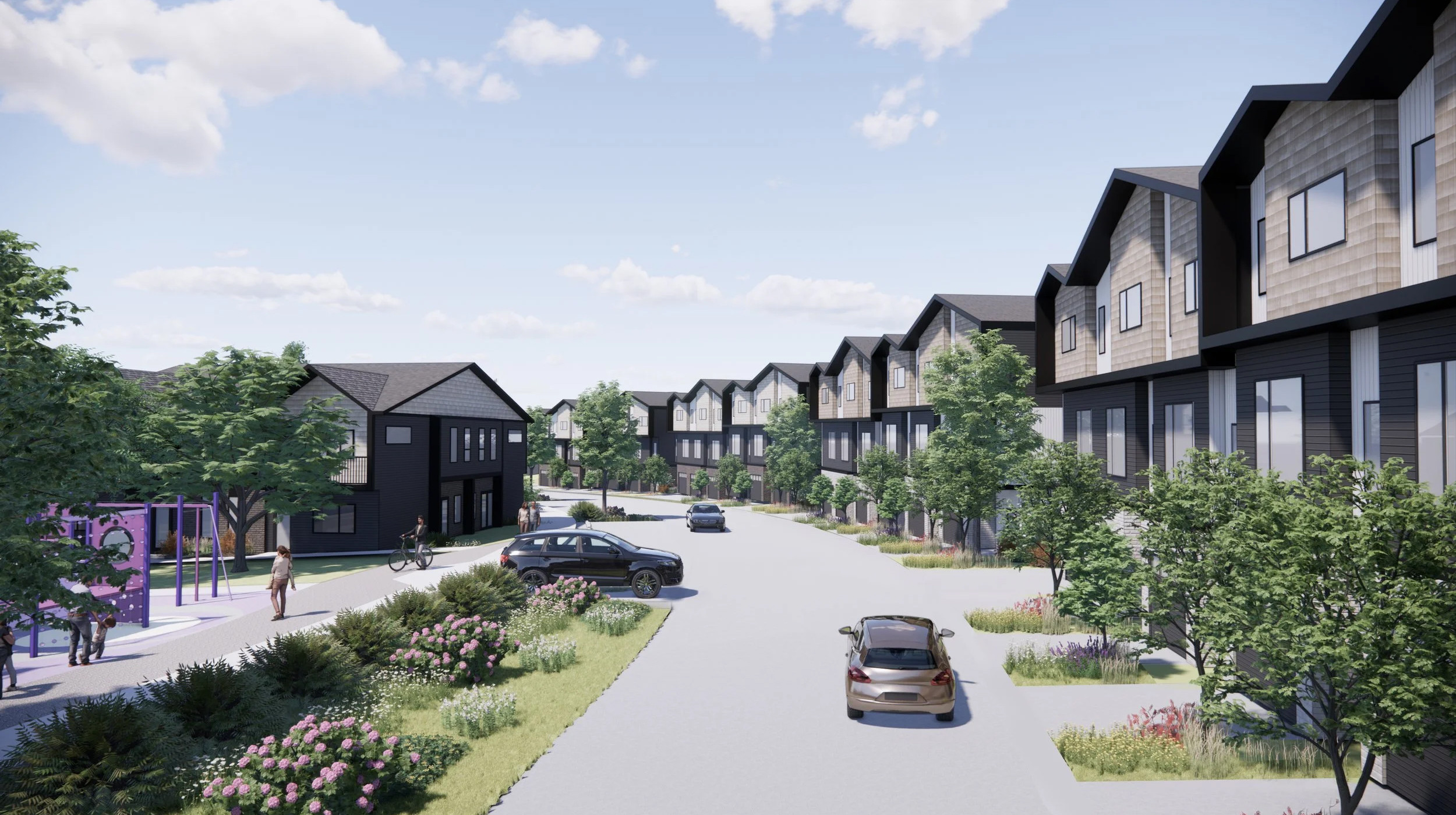 The townhouses create a well-defined street wall along Na’a Drive, while the villas frame a large central park amenity featuring a playground, community gardens, and a fruit orchard, emphasizing both community and open space. The development places a strong emphasis on legibility, ensuring well-defined residential entries, varied cladding, and peaked roof framing, creating a pedestrian-friendly environment.