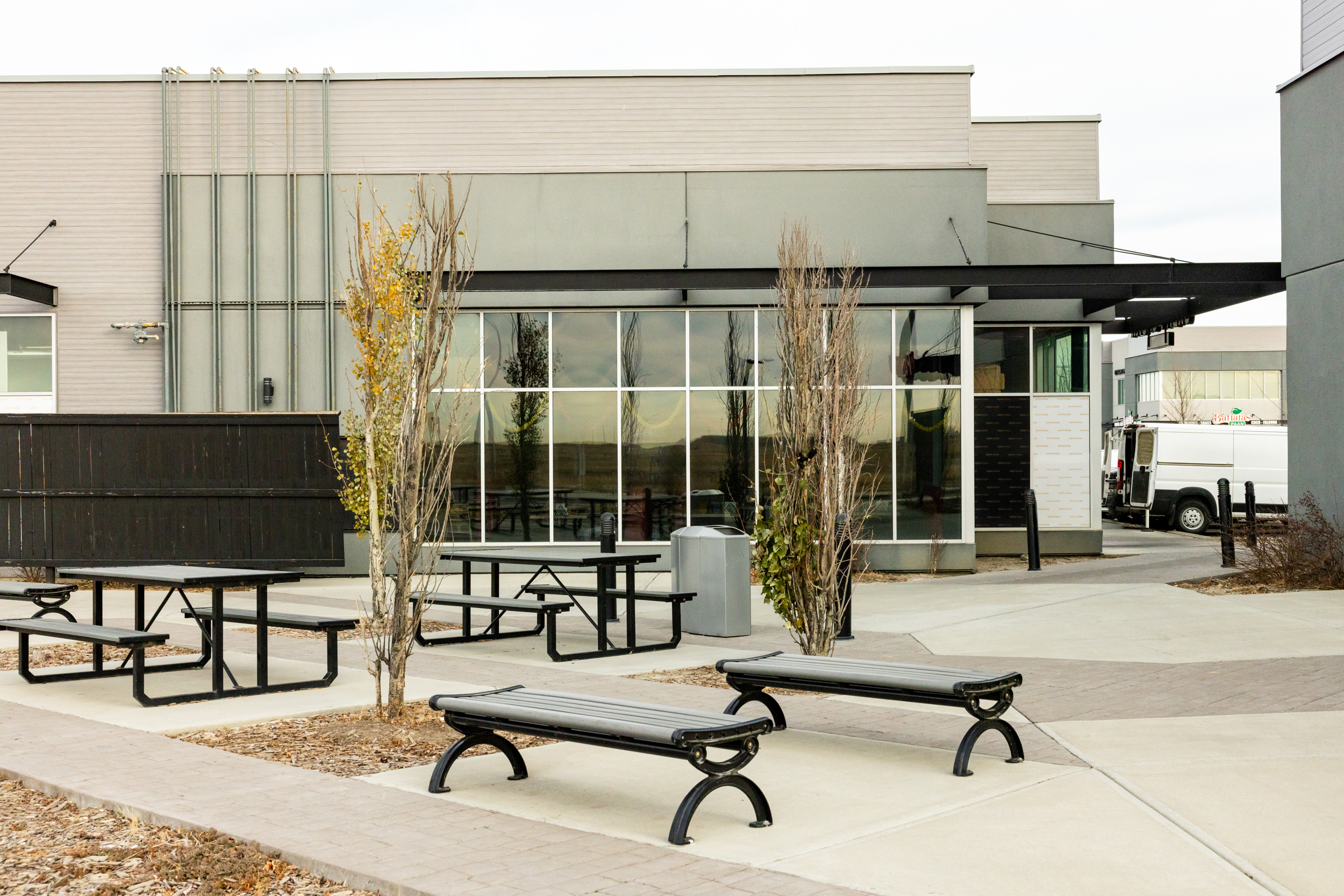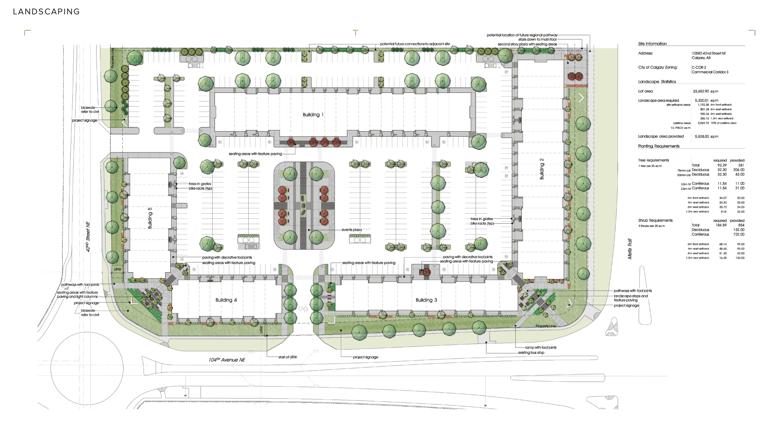 The project has been designed to provide a strong edge condition to the public streets, with emphasis on the corners due to public visibility.  Outdoor amenity spaces are located on each of the south corners and provide strong pedestrian connection to the adjacent public sidewalks and Regional Pathway located along Metis Trail.  These amenity spaces are animated by the adjacent buildings, and are connected to a strong pedestrian circulation network with in the development.  This network is further reinforced with additional gathering spaces as well as clearly articulated amenity elements for each building.
