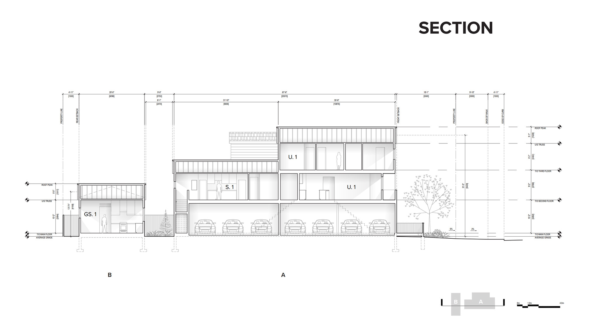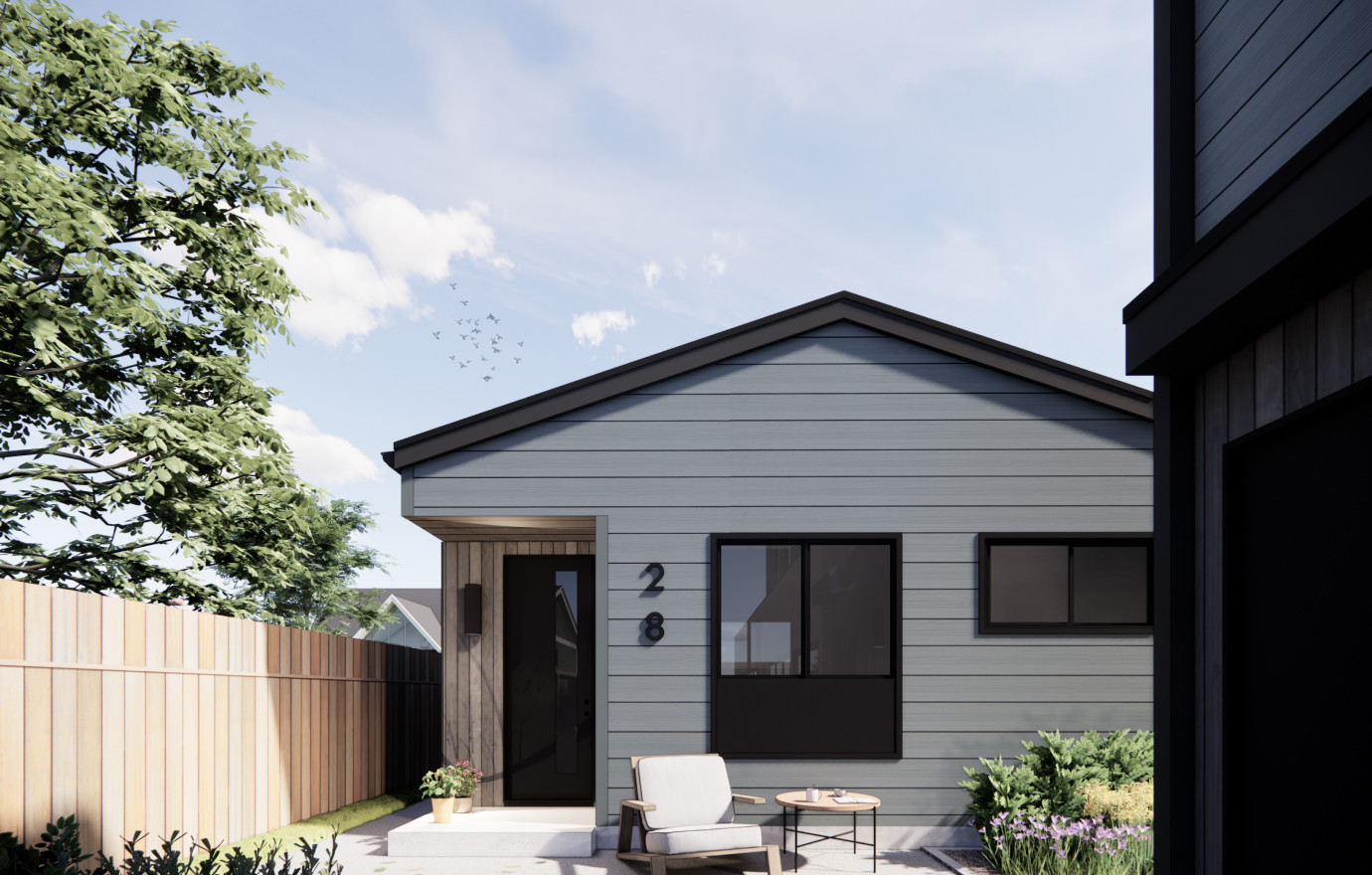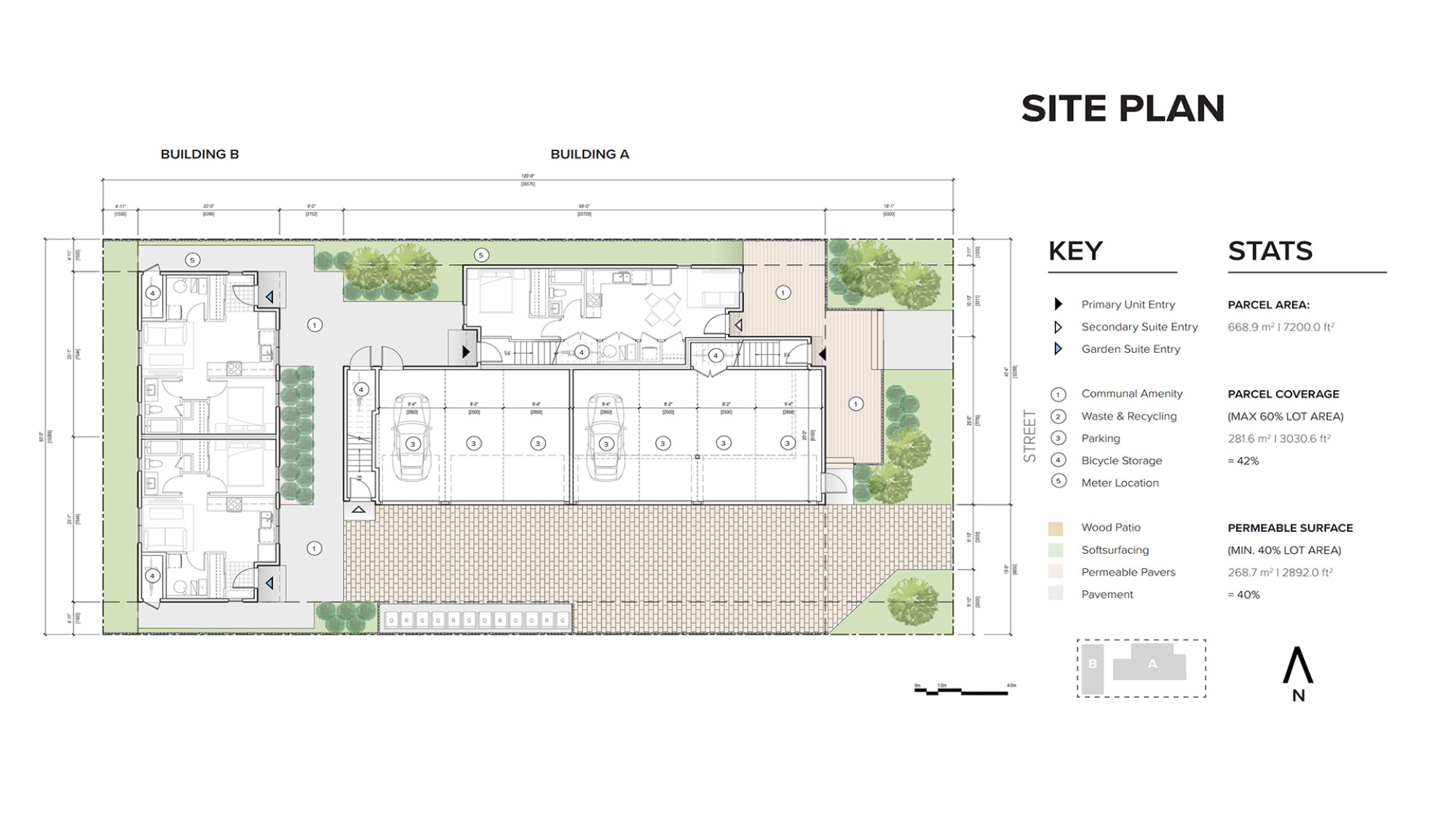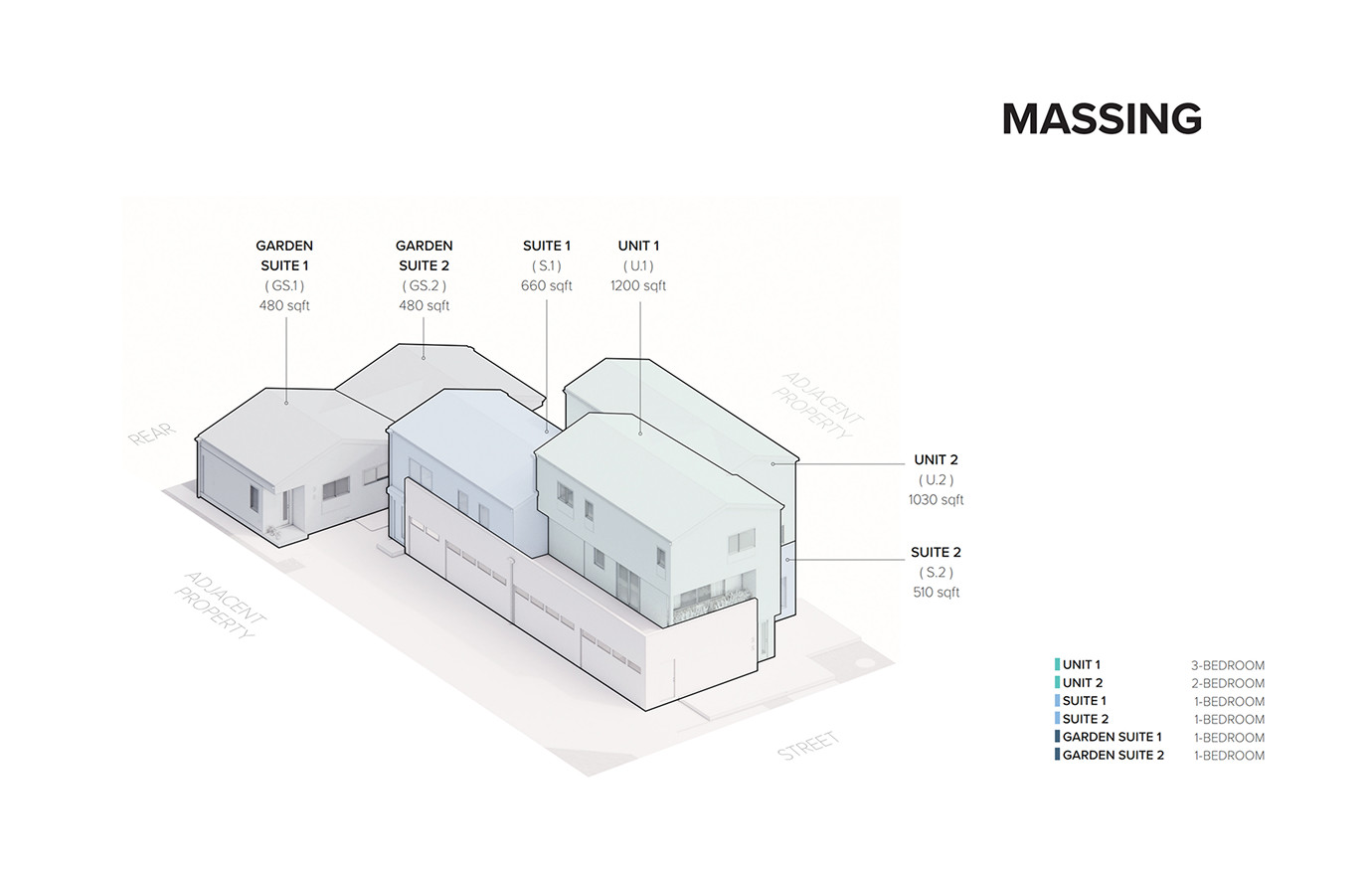 At first glance, Hideaway 6 appears to be either a single-family home or a duplex from the street. However, six dwellings have been carefully designed on an approximately 668m² midblock lot. Two Urban Infill Residential Units, with two Secondary Suites and two Garden Suites have been proposed, which aligns with RS-1, RS-1a, and RS-1c zoning. The building massing has been oriented so that vehicular access is at the front of the lot, via a permeable paved driveway. A unit mix of one 2-storey 3-bedroom unit, one 2-storey 2-bedroom unit, and four 1-bedroom suites provide ample choice for residents.