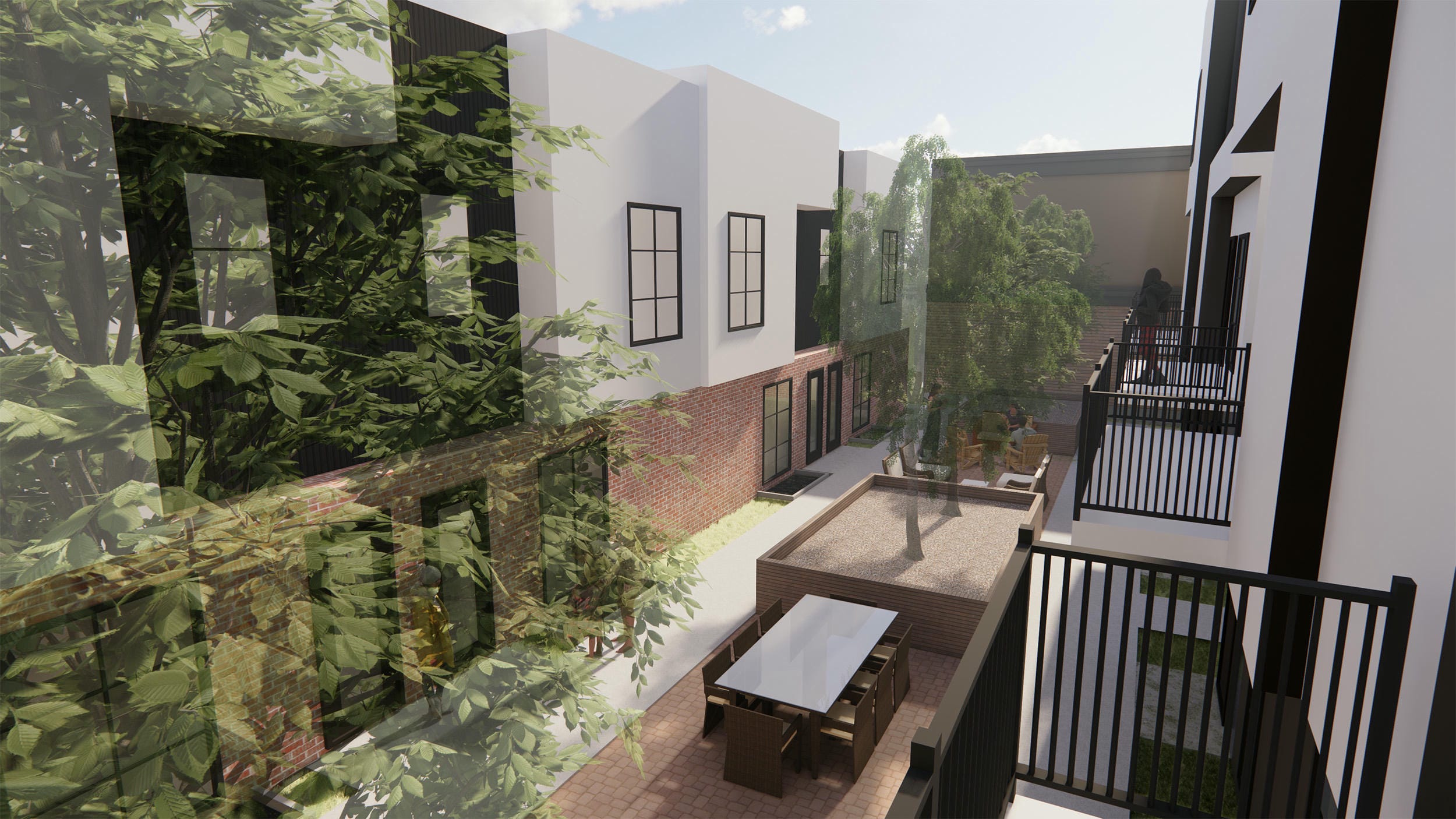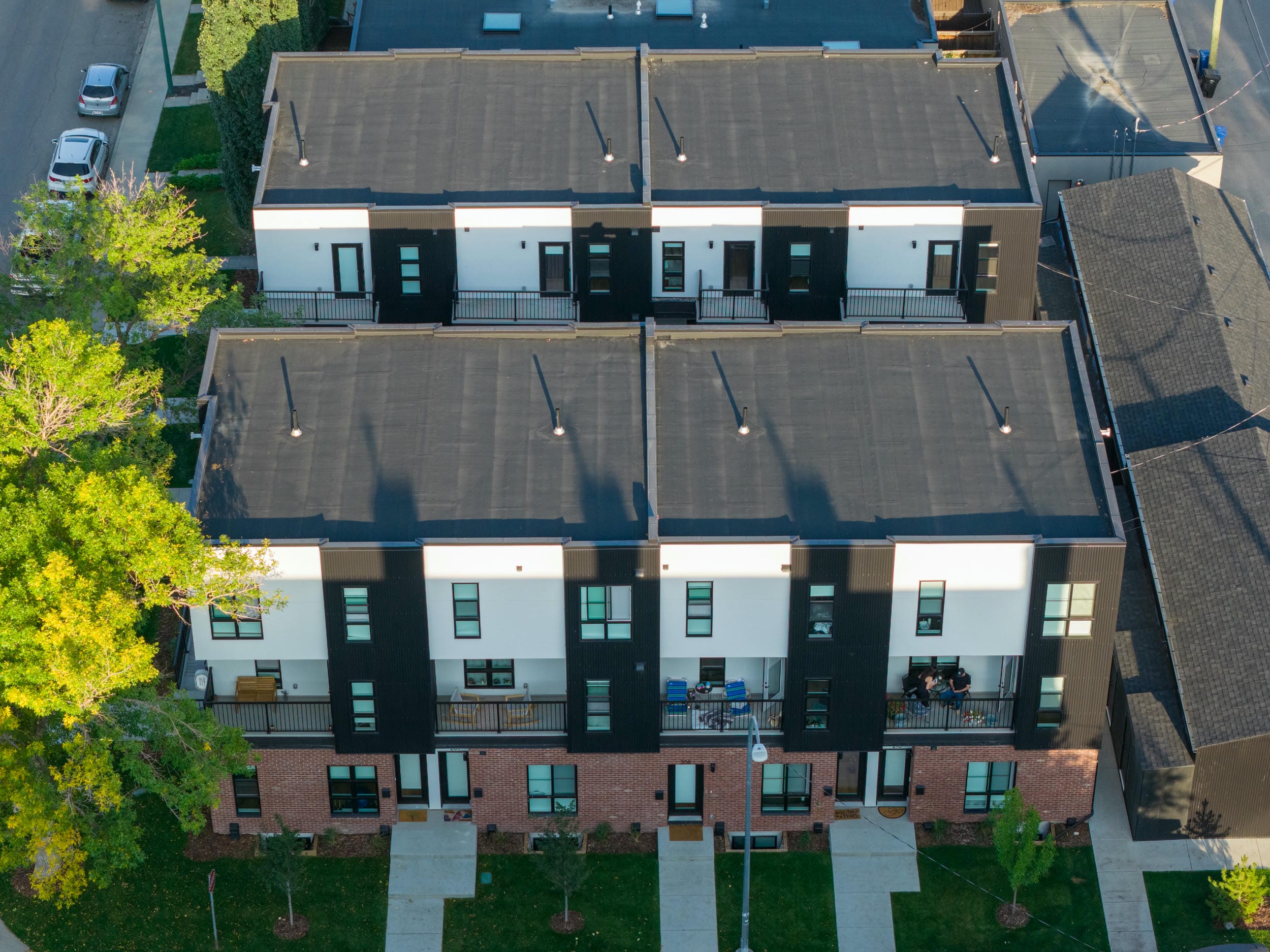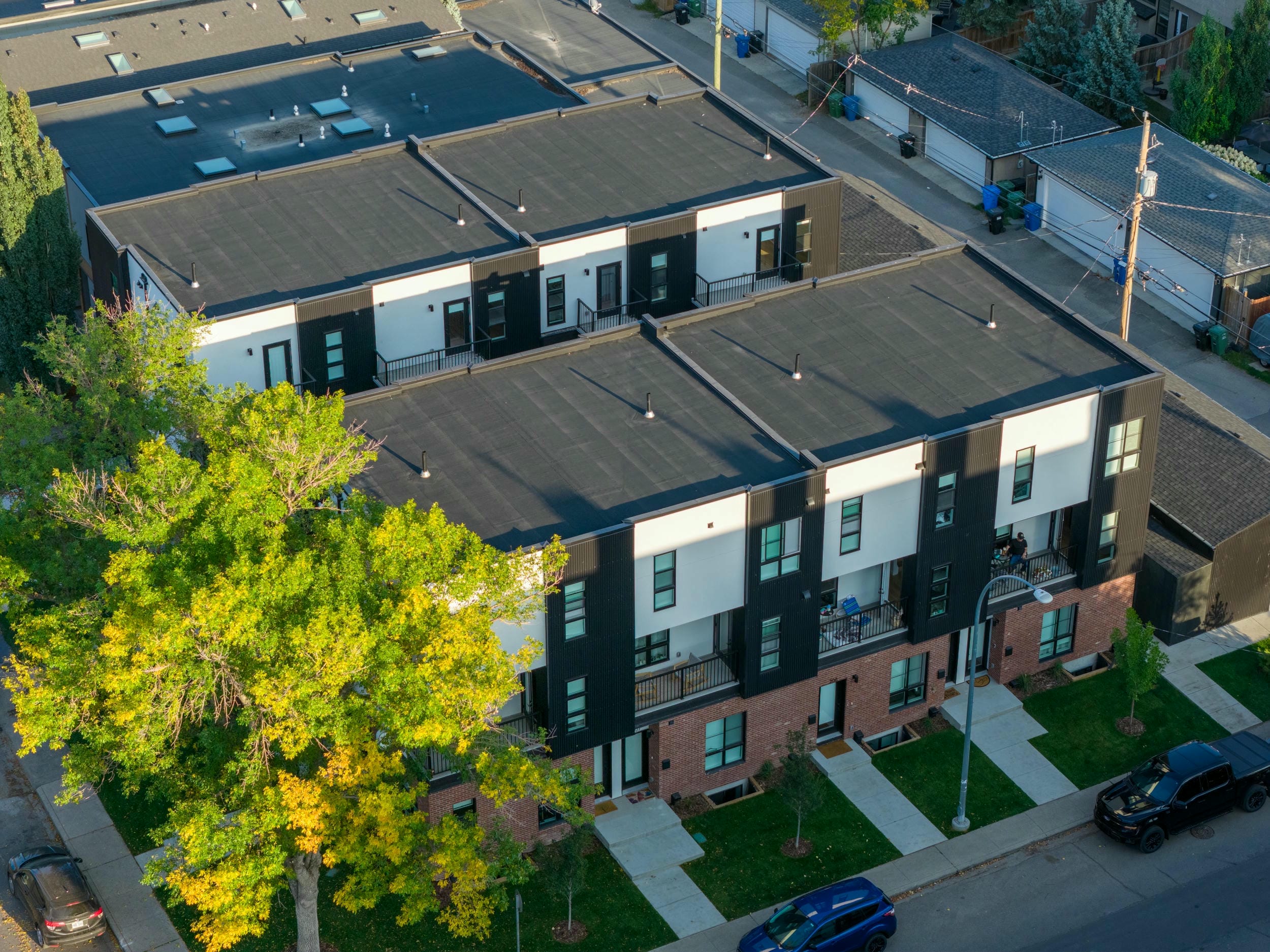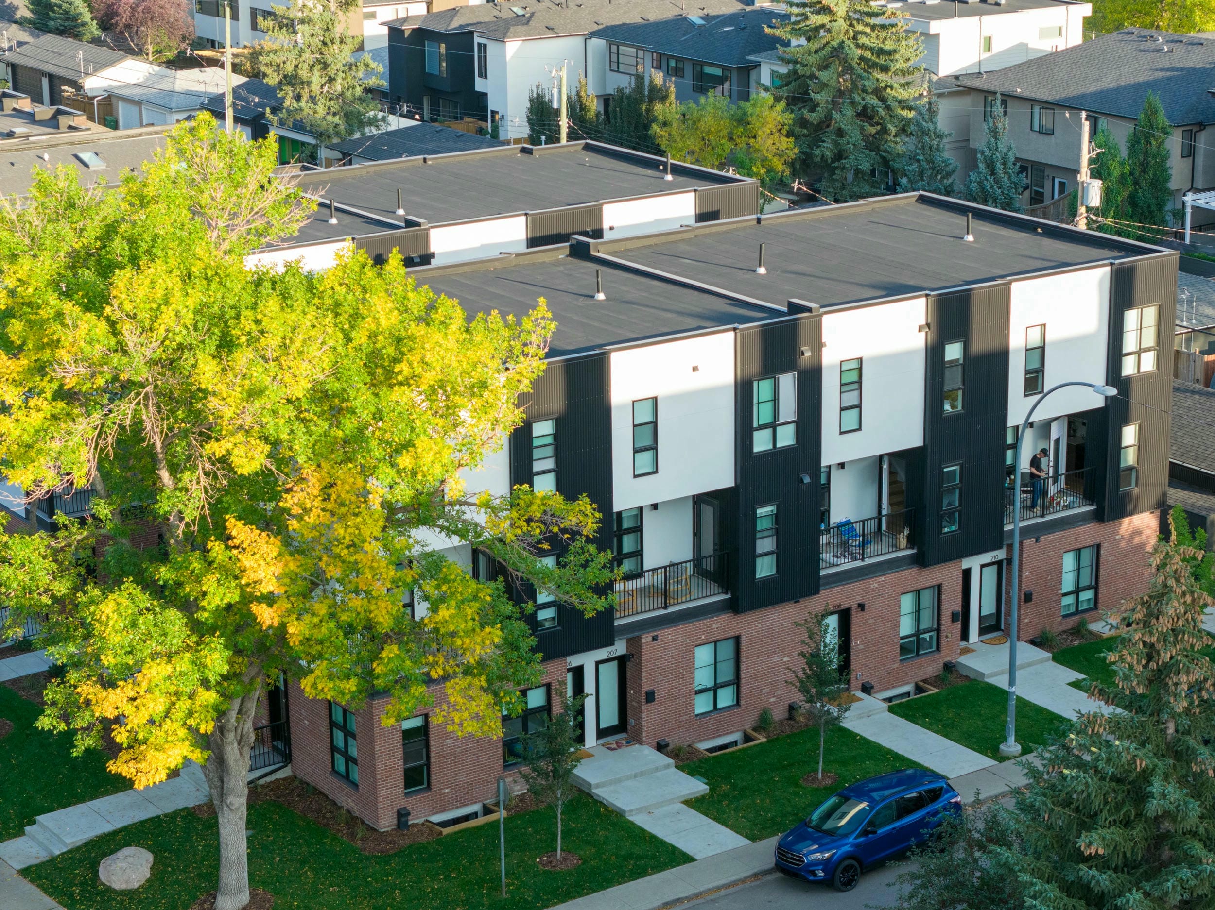 Nestled in the heart of Altadore, Loop 33 is designed to enrich the ever-evolving culture of this vibrant community and the greater Marda Loop area. At the core of Loop 33’s design philosophy is a commitment to providing diverse housing options while fostering a sense of community through a large central amenity area. This development totals 22 units, 8 upper townhomes, 2 ground level flats, and 12 lower & ground level units. This shared space is carefully integrated into the overall site strategy and building massing and serves as a focal point for residents to connect and engage, featuring programmed seating areas, a BBQ, and lush soft landscape buffers.