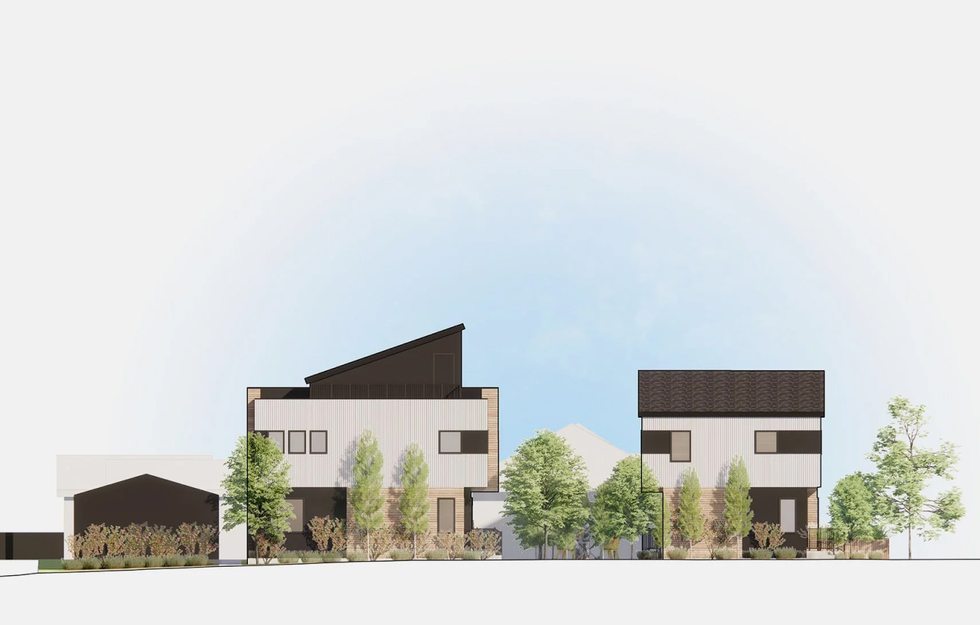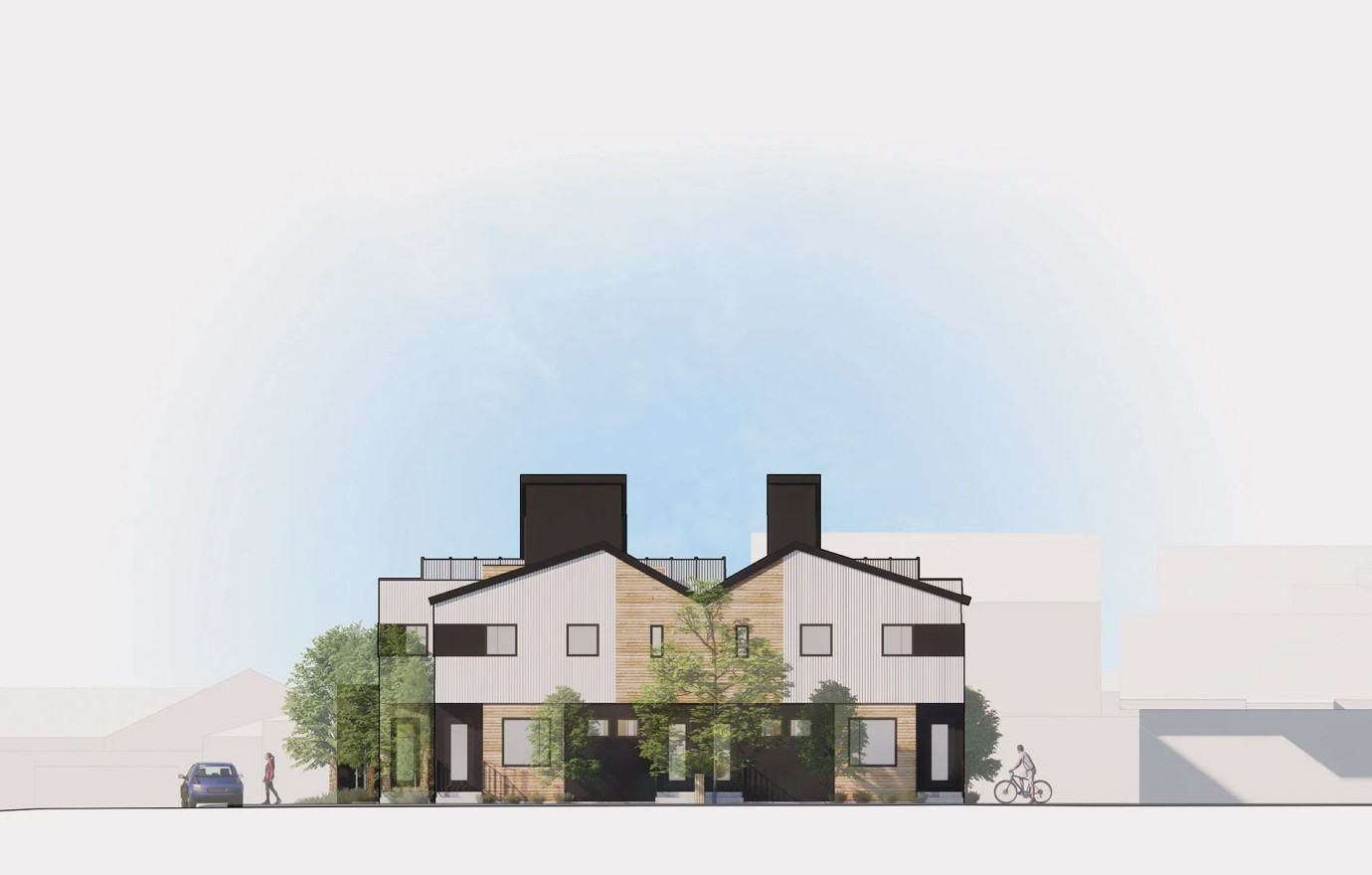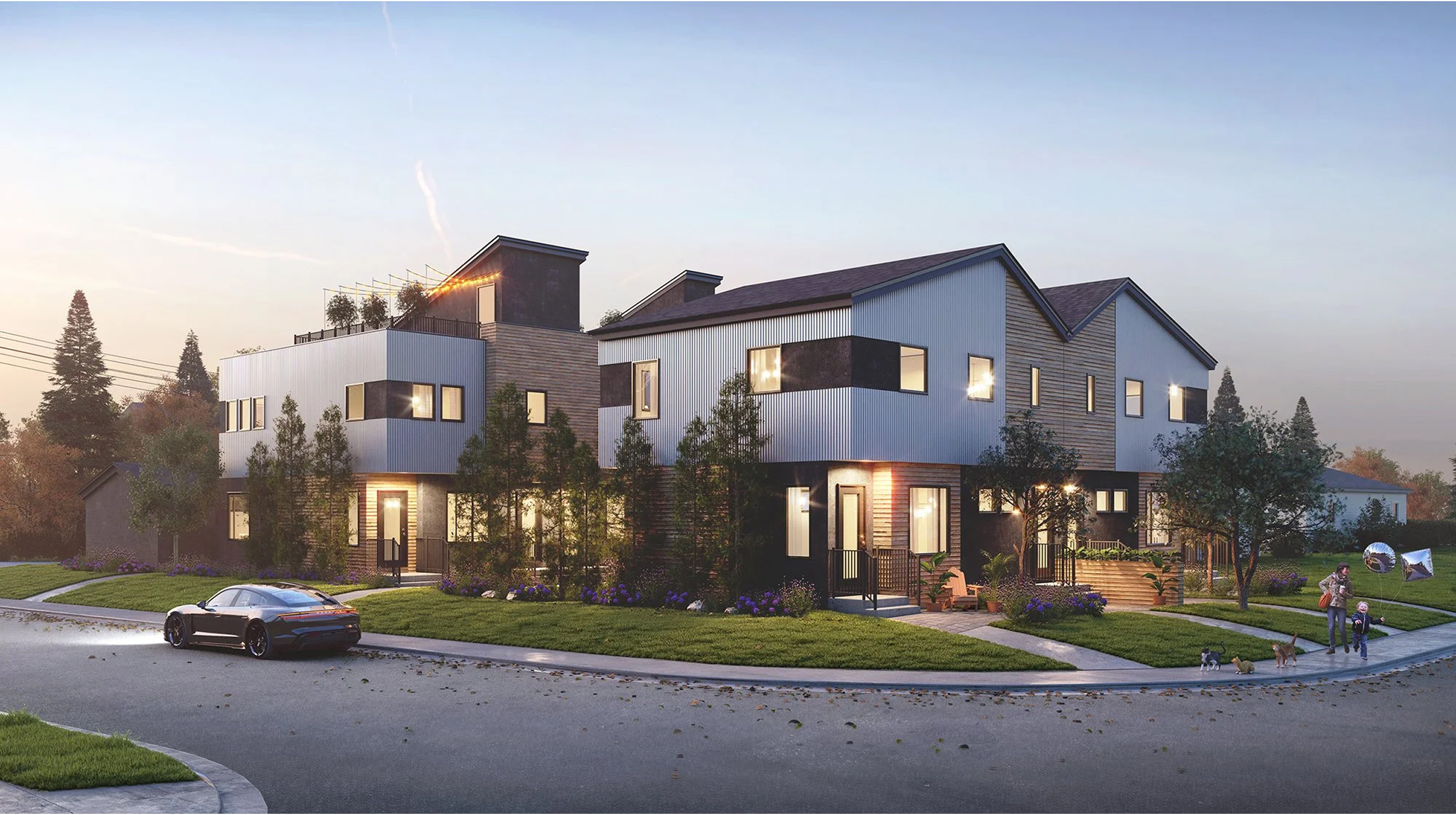 RK22 is situated in the community of Richmond and is comprised of a compelling two-phase development, consisting of two-story, three-bedroom townhouses and one-bedroom secondary suites located below grade. The project also incorporates an enclosed garage and strategically places bicycle parking along the adjacent lane. The architectural finesse is evident in the thoughtful use of white corrugated metal cladding, adding both texture and light to the design.