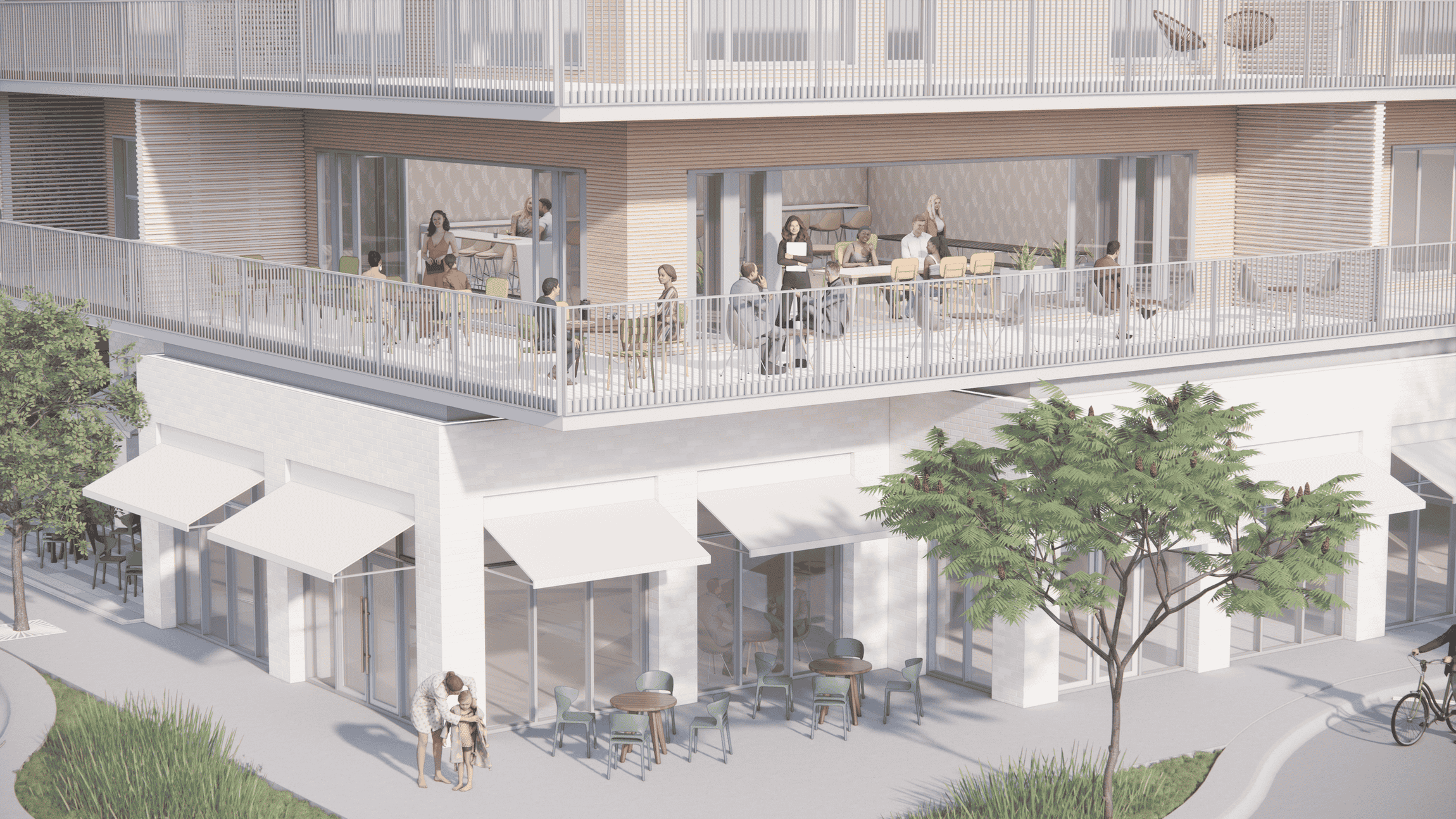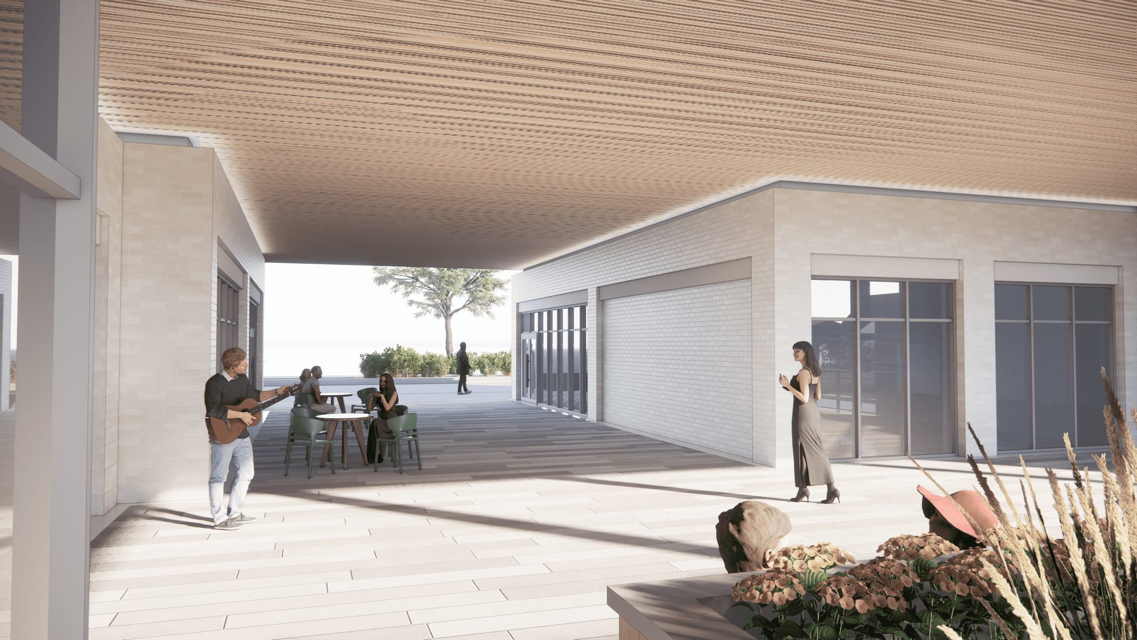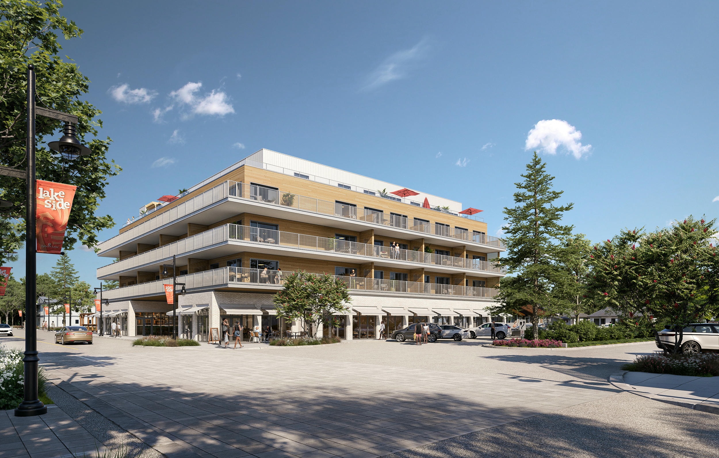 Sylvan Lake mixed-use building consists of 43 residential units and 3 commercial units, designed to strengthen and anchor mixed-use development on the two major streets. The building design pays homage to Sylvan Lake’s historic hotels, using materials and aesthetics that highlight the area’s charm, with the intent of attracting more visitors to the lakeshore. A key feature is the 5th-floor common outdoor amenity space for residents, offering a unique communal area with stunning views. Additionally, the project includes a covered courtyard space that supports year-round use and increased commercial frontage opportunities. Multiple circulation paths are incorporated into the design to invite people into the public space, creating a more engaging and dynamic environment.
