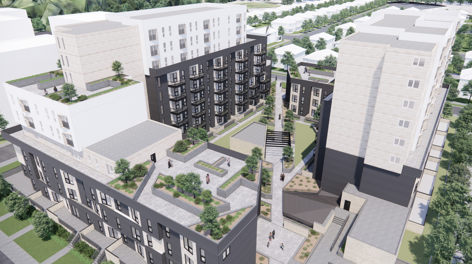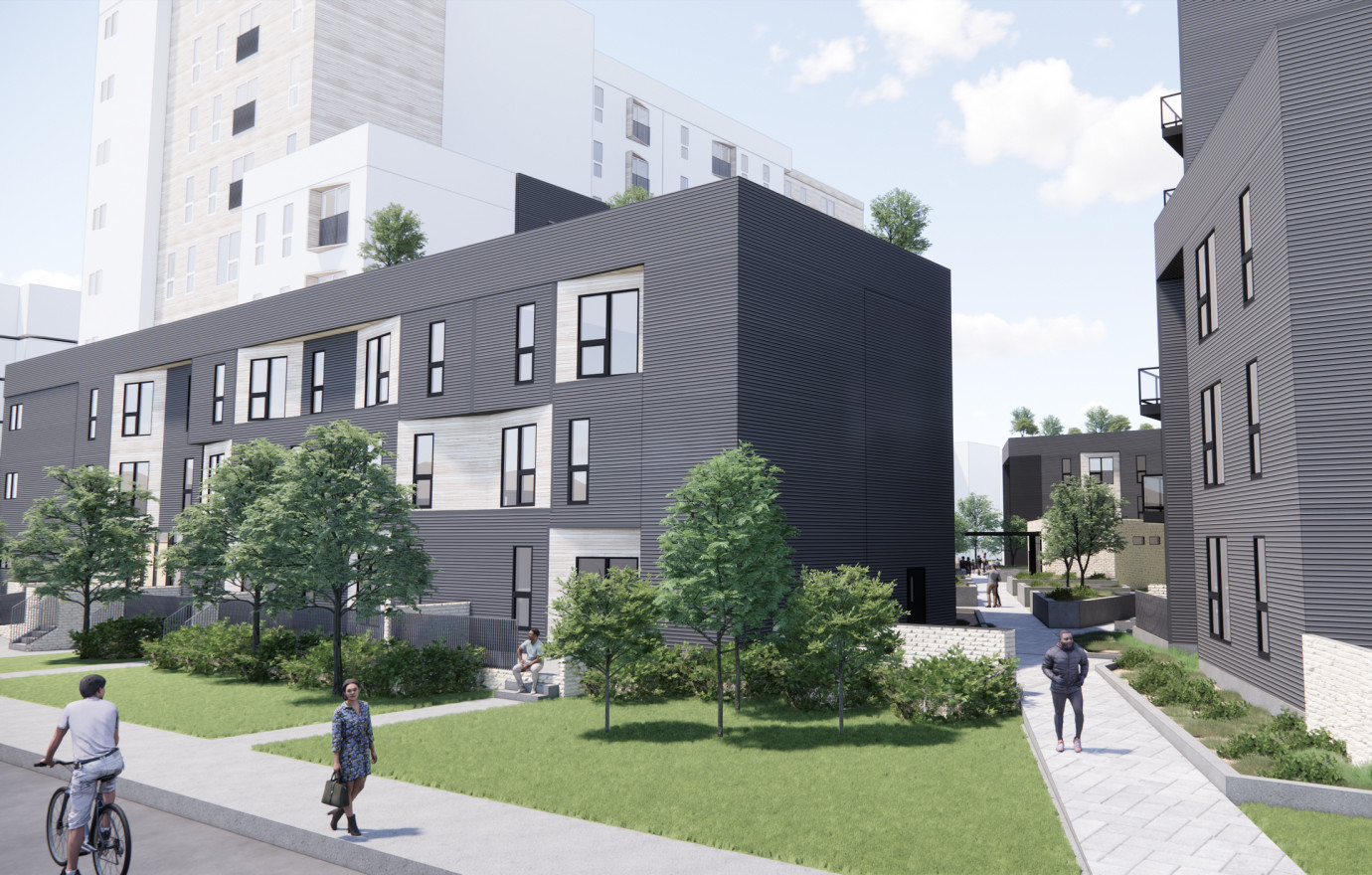 The design concept bisects the massing to create a central courtyard that is connected to its context through a central green promenade, providing a generous amenity for both residents and the public. Step backs on the top two floors and material transitions breakup the massing to create a more scale sensitive transition from lower-density developments, as well as allowing greater sun penetration into the amenity and visual articulation.
